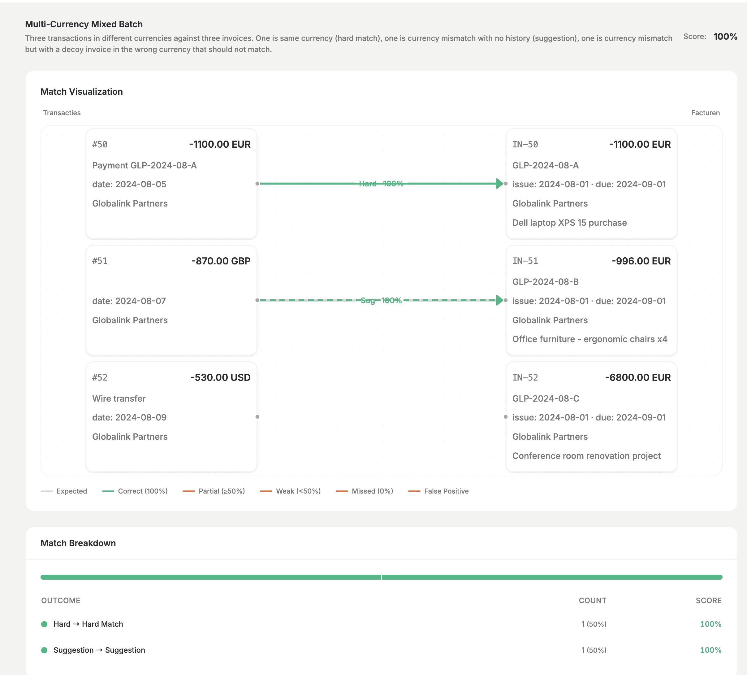 Wanneer we een test uitvoeren, zien we precies hoe de matcher zich op elk scenario heeft gedragen: welke transactie-factuurparen het heeft voorgesteld, hoe dat zich verhoudt tot wat we verwachtten, en een score.