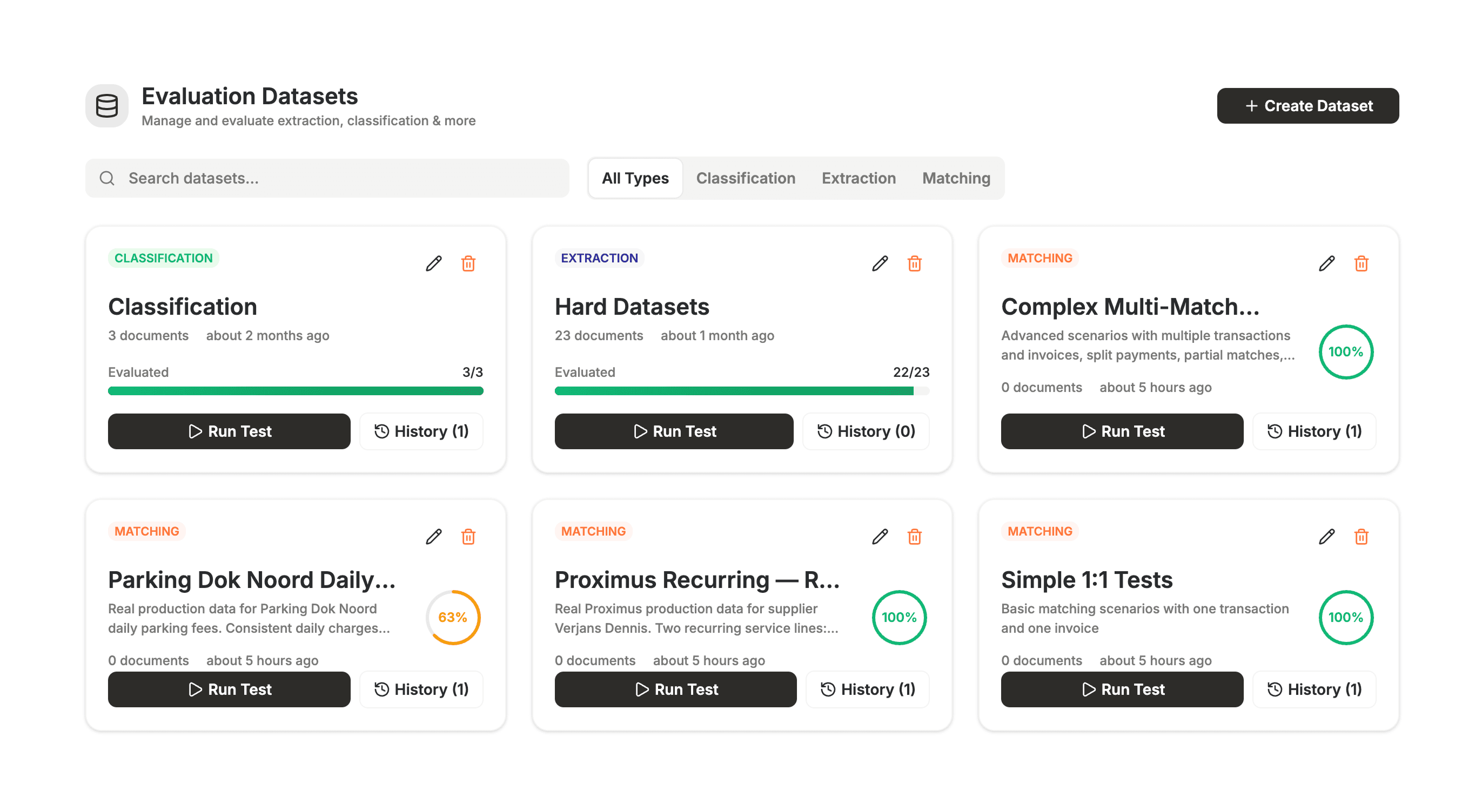 Datasets: We definiëren evaluatiedatasets op type: extractie, classificatie of matching. Elke dataset is een zorgvuldig samengesteld set invoer en de "juiste" antwoorden die we verwachten.
